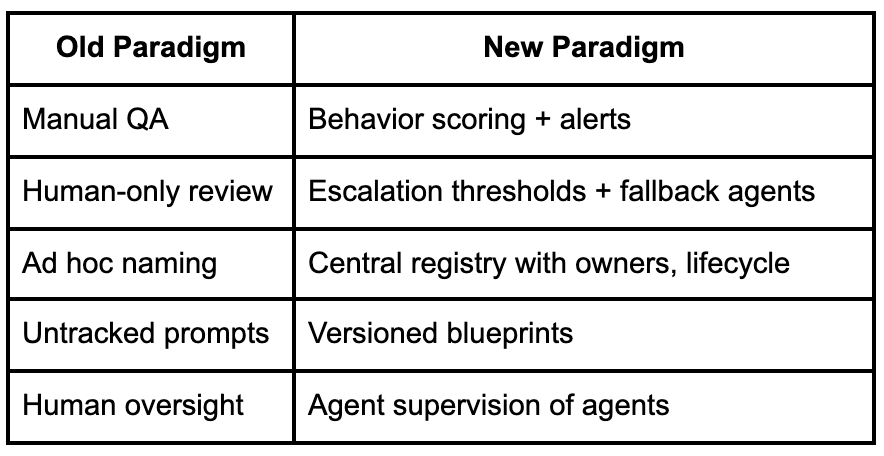 To illustrate how agent governance must evolve, consider the contrast between how legacy systems were managed versus what’s needed for scalable supervision: